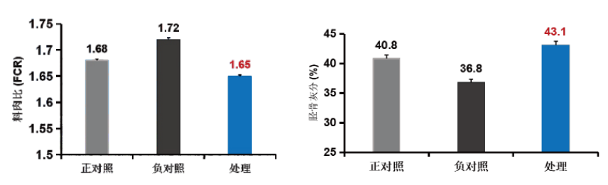 1200只1日龄白羽肉鸡(公母各半)饲喂玉米豆粕型日粮至42日龄。试验设正对照、负对照和处理三个试验组。正对照为正常添加磷酸氢钙,不添加植酸酶;负对照为在正对照基础上减去0.1%有效磷;处理为在负对照基础上添加100g/t迈特S耐高温植酸酶。如图所示,迈特S耐高温植酸酶不仅有效提高了胫骨灰分含量,而且提高了饲料转化率,提高了经济效益。